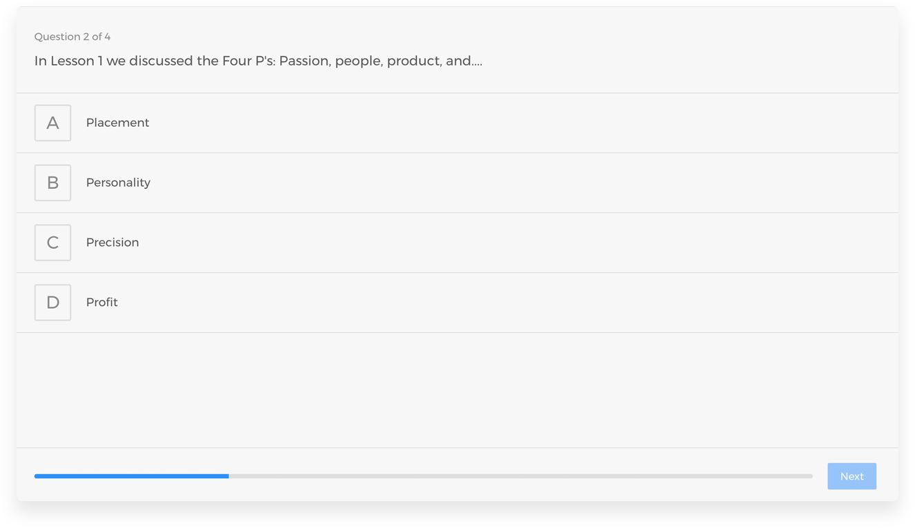 Imagine being able to have the power of quizzes, uploadable documents for homework, and even the ability to require completion of an assessment before moving on (COMING SOON)... all built into the course experience. Even the ability to tag members based on quiz responses.